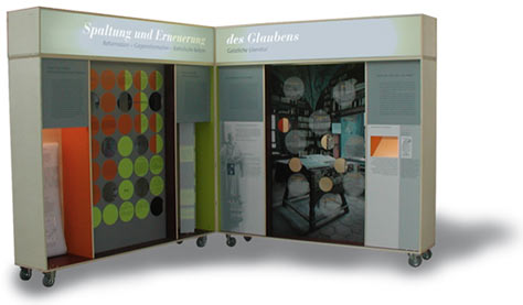 Die Rückseiten der Bücher tragen einen Buchrücken mit dem Titel und einem fragmentierten Stich zum Kapitel. Zum Transport können die rollbaren Bücher zusammengeklappt und geschlossen werden. An jeder der zwölf Ausstellungsstationen lässt sich die Ausstellung speziell auf die vorhandene Fläche abstimmen.